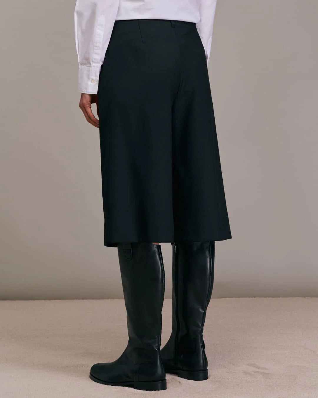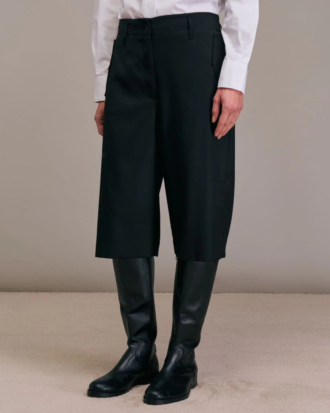 Bermuda realizzati in filato misto cotone. Vita media con passanti per cintura. Tasche laterali. Dettaglio pinces sul davanti. Colore NERO
