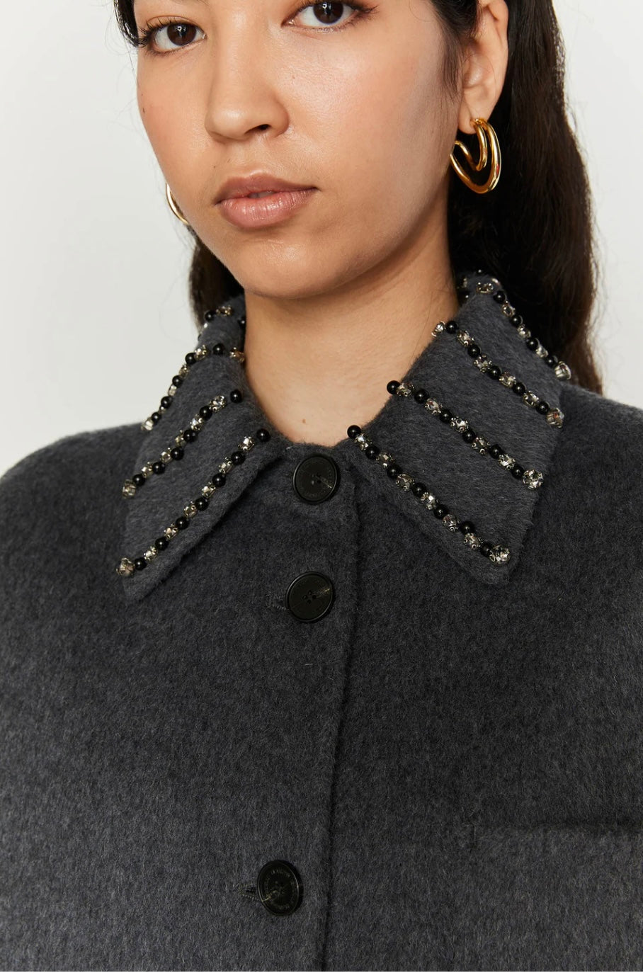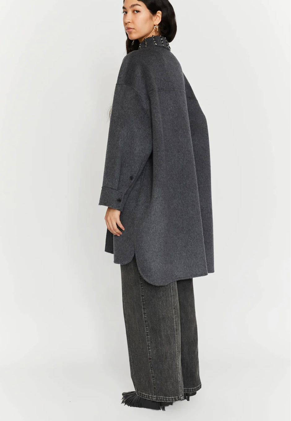 CAPPOTTO CHEMISIER IN DOPPIO TESSUTO DI LANA CON RICAMO SUL COLLO. DETTAGLI:La modella indossa la taglia S-40 italiana ed è alta 179 cm COMPOSIZIONE:100% FODERA LANA 55% POLIESTERE 45% VISCOSA