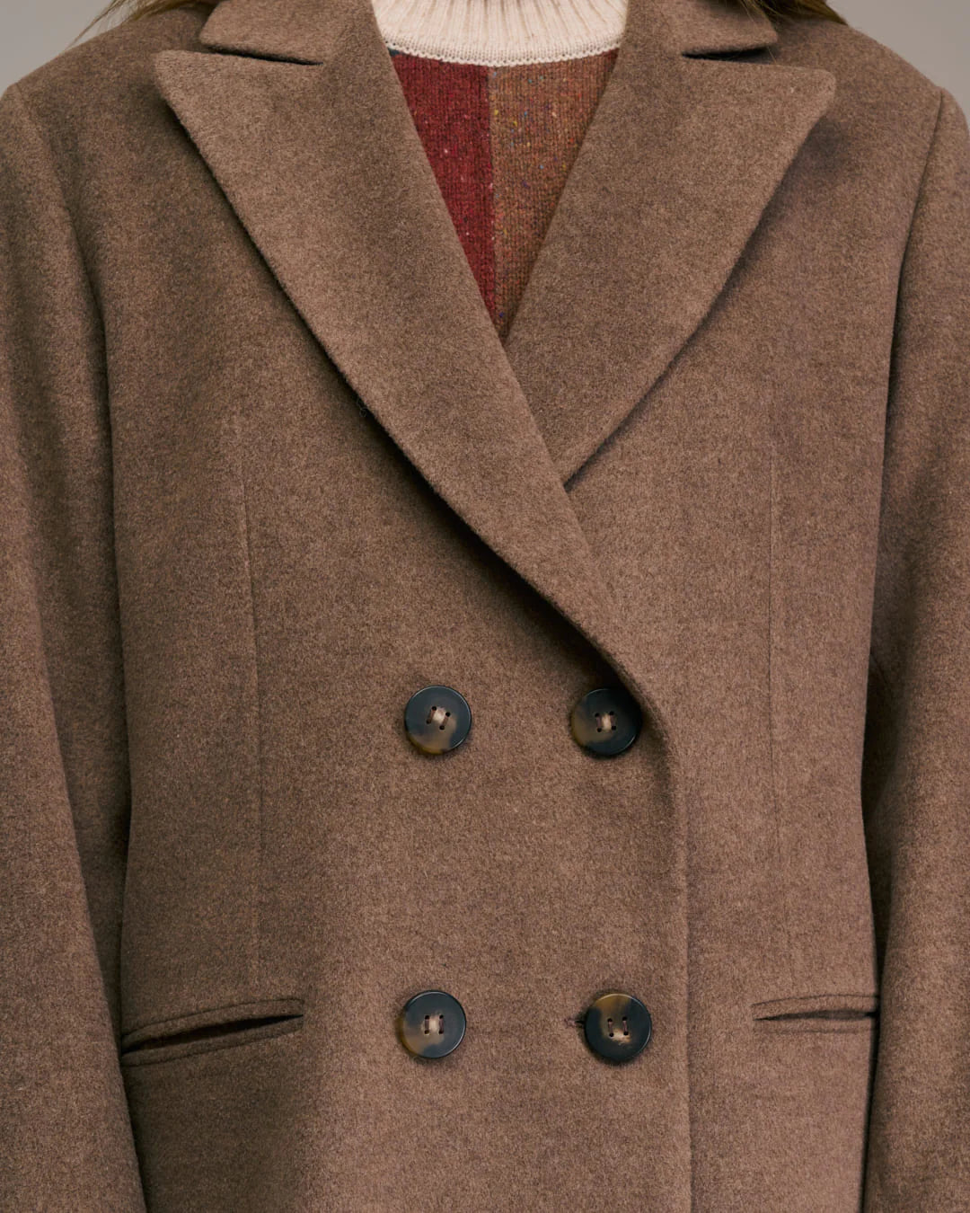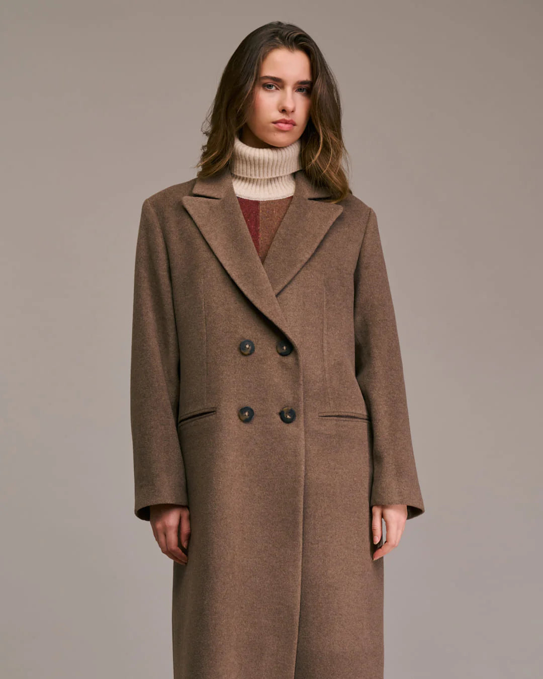 Cappotto lungo a doppio petto, con collo con revers e maniche lunghe con spalline. Con tasche a filetto sul davanti e spacco centrale sul retro. Chiusura con bottoni a vista sul davanti.