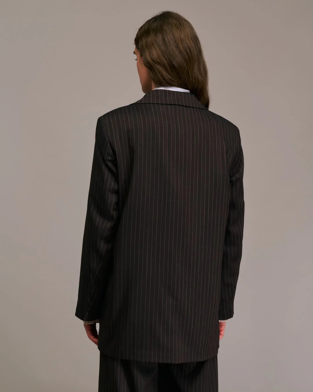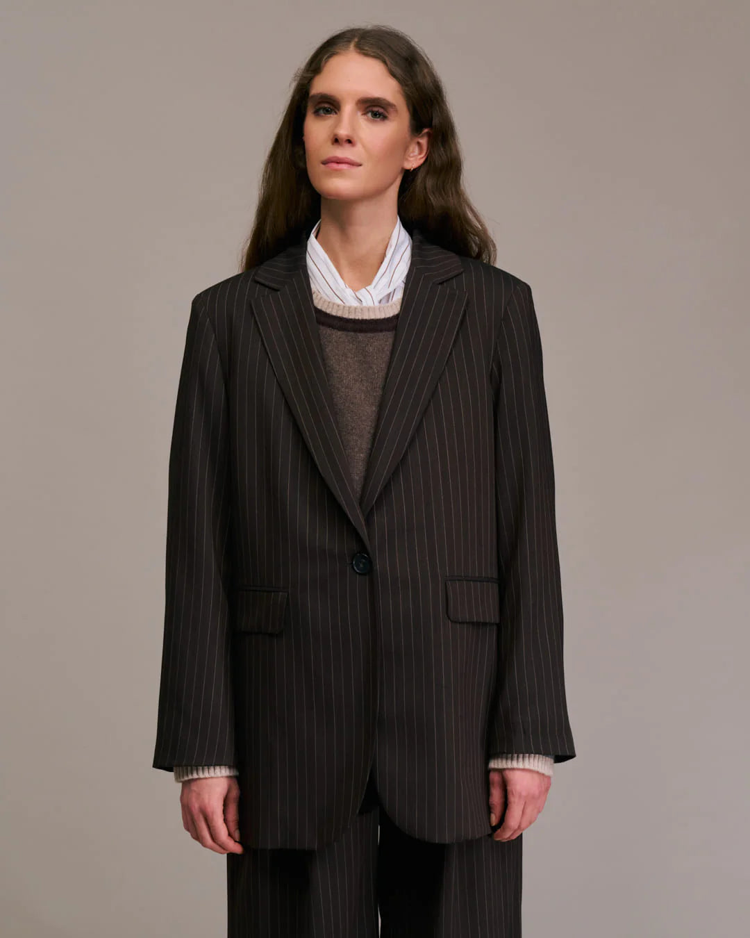 Giacca lunga con collo alla coreana, chiusura con un bottone. Tasche applicate.