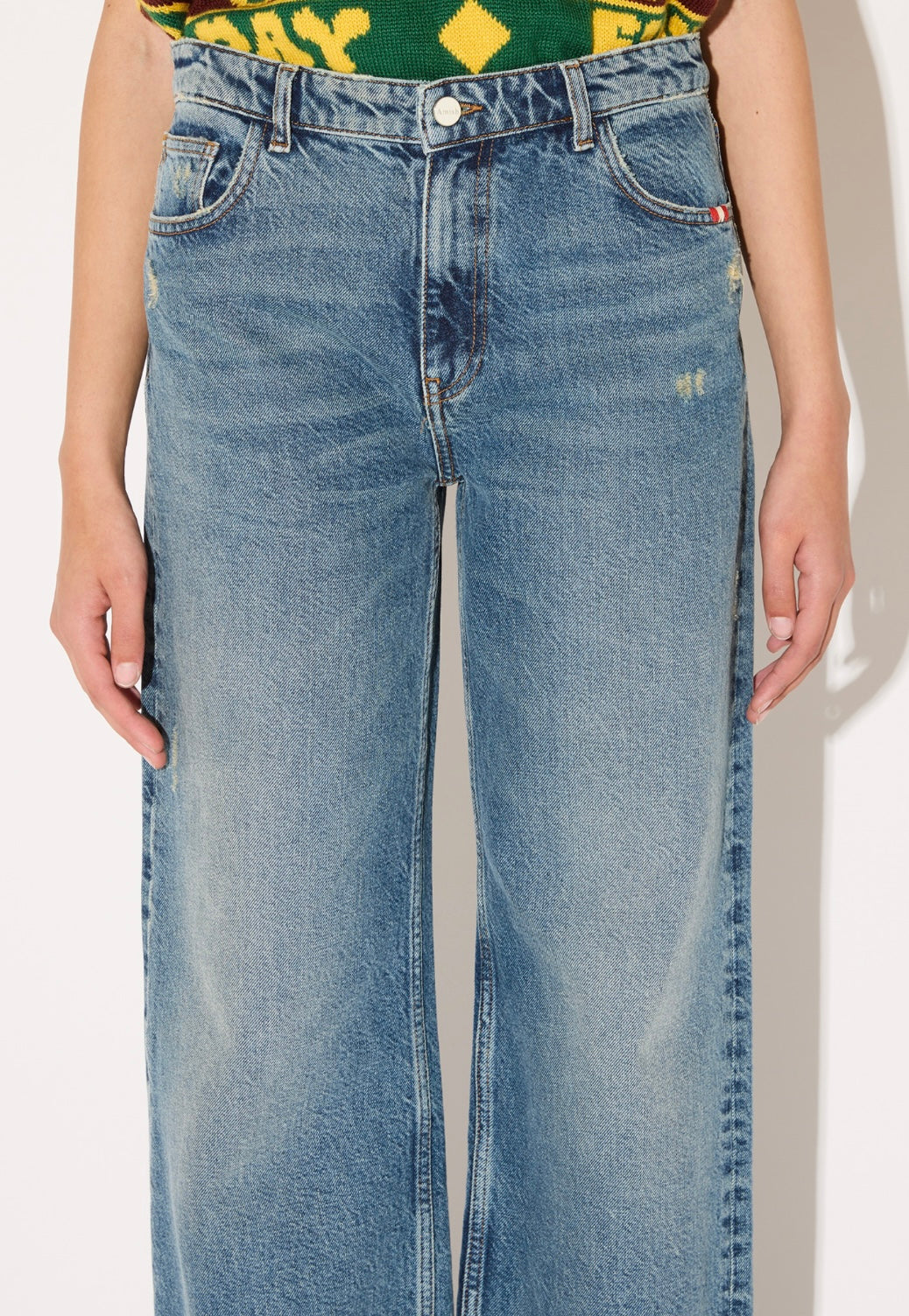 - Denim Recycled dust con lavaggio medio e strappi effetto used sul fronte.