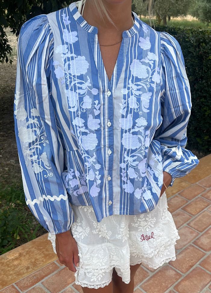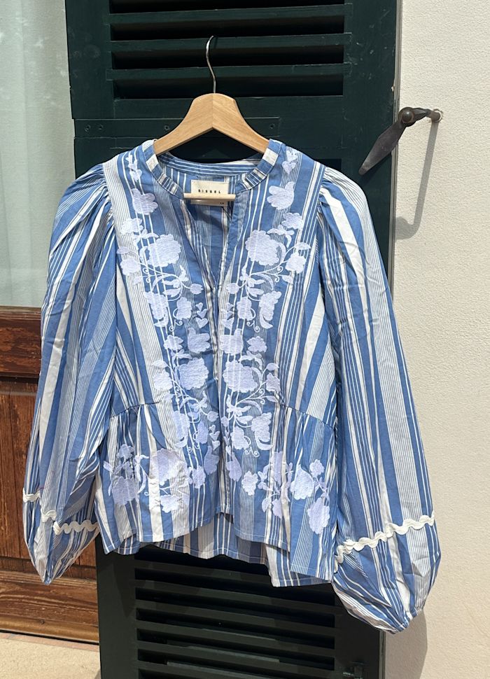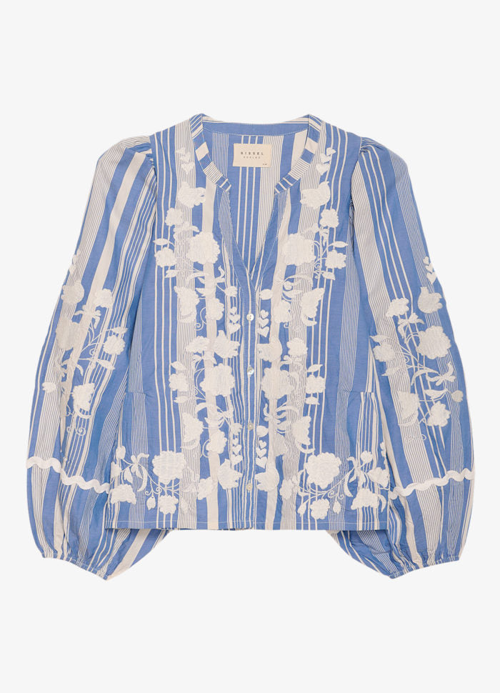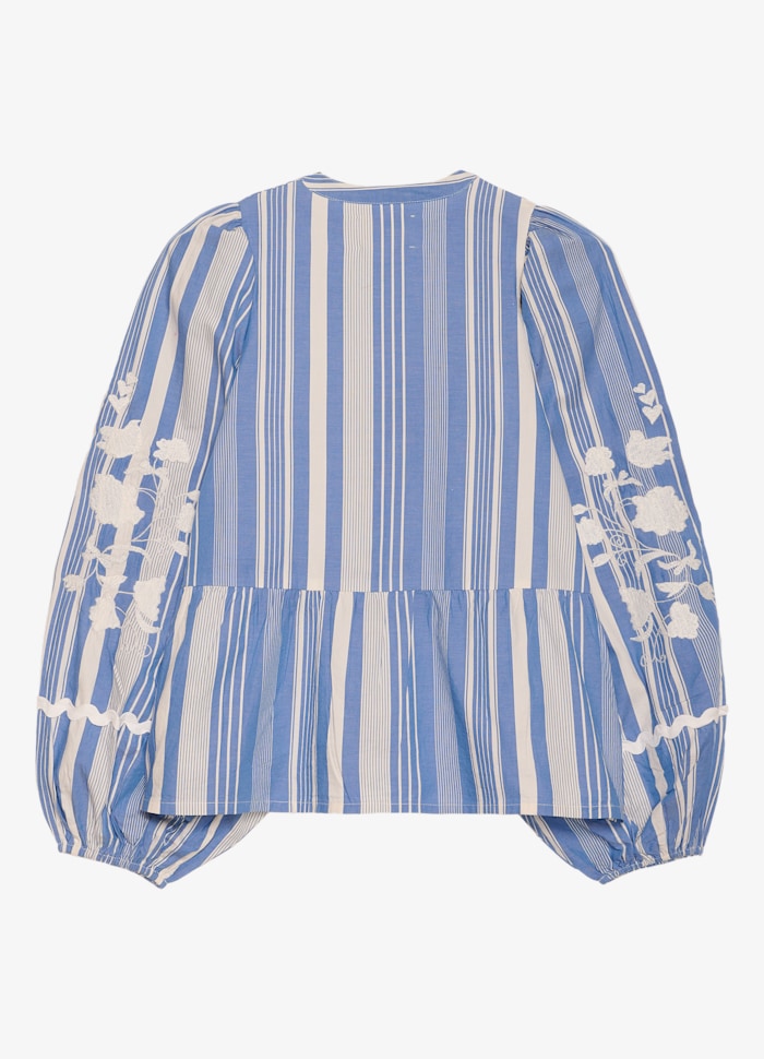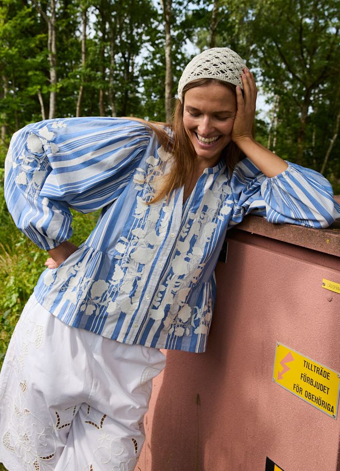 Juliane Top è una blusa femminile dalla vestibilità ampia, realizzata con cotone di scarto in righe tinte in filo. Presenta uno scollo a V con colletto sottile e abbottonatura frontale. La linea della vita è modellata con dettagli tagliati e inseriti sia sul davanti che sul retro, creando morbide arricciature per una silhouette slanciata. Le voluminose maniche a palloncino sono arricciate e rifinite con elastico all'interno delle aperture. Il top è decorato con nastro a zig-zag e delicati ricami floreali in tinta unita, disposti con eleganza sul davanti e sulle maniche.
