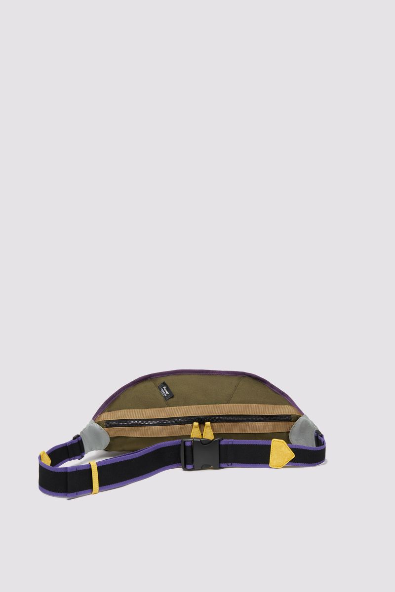 Marsupio in tessuto tecnico rip stop con zip frontale e dettagli di nastro tecnico a contrasto lungo i bordi. Fascia/bretella regolabile e piccole coulisse laterali.