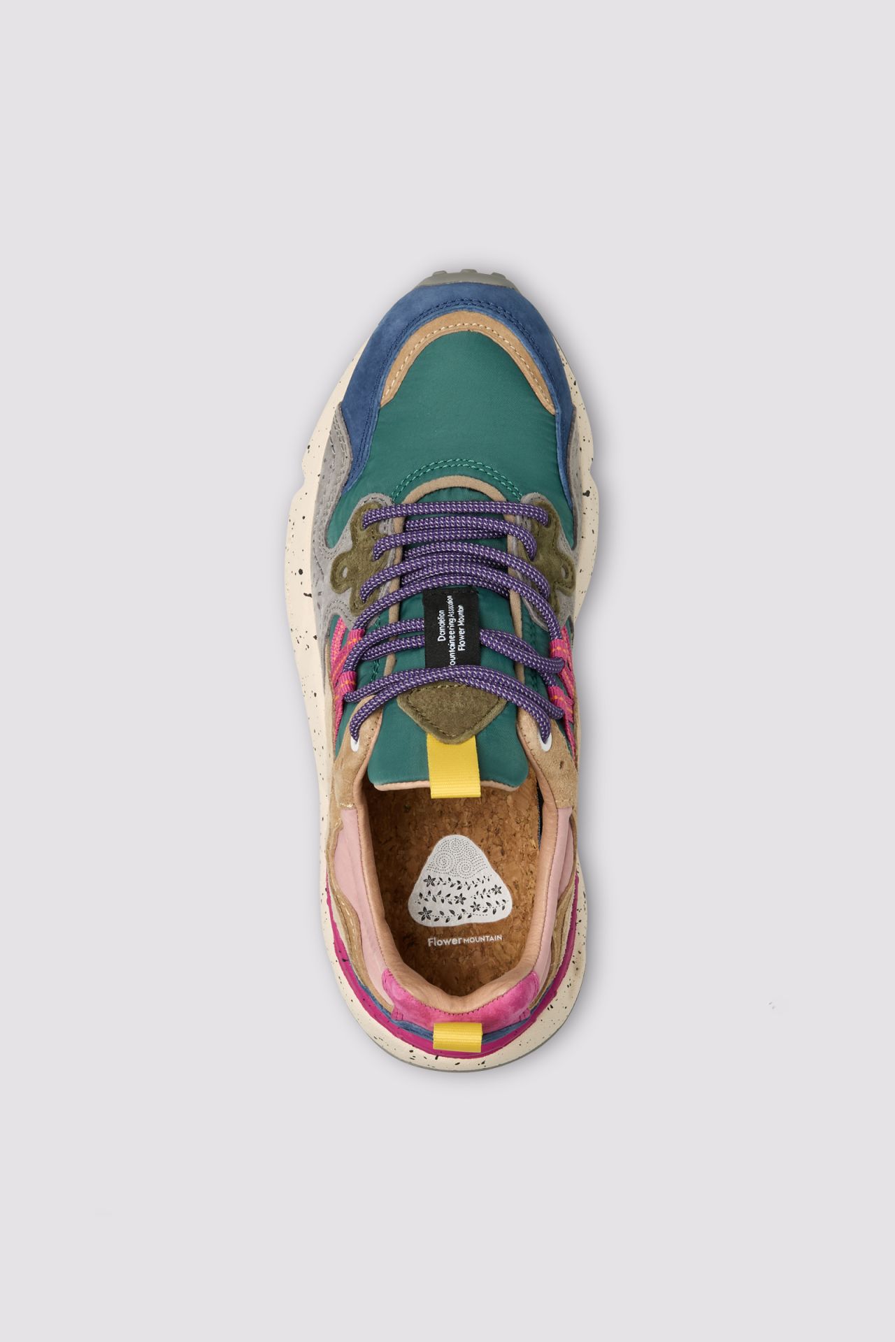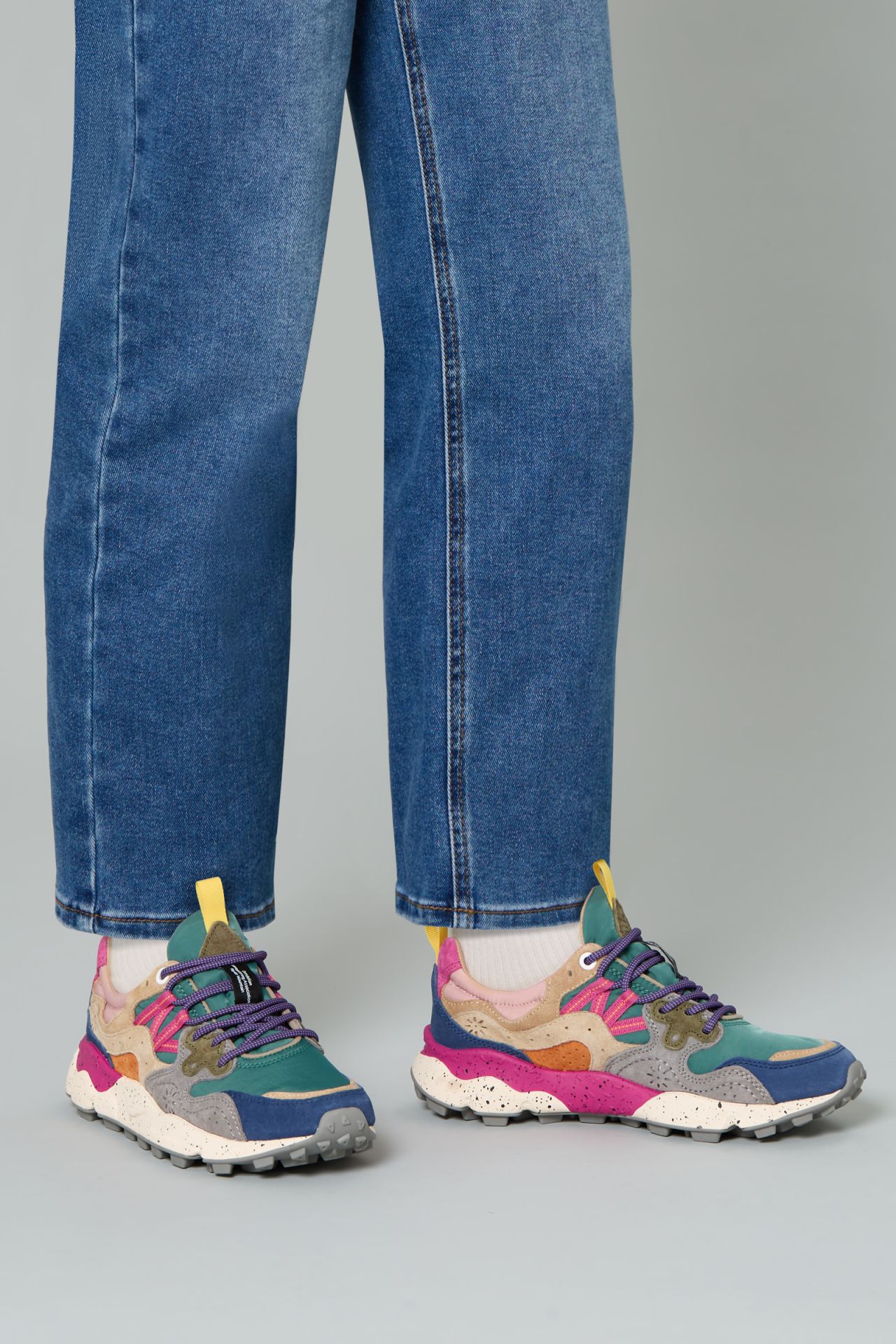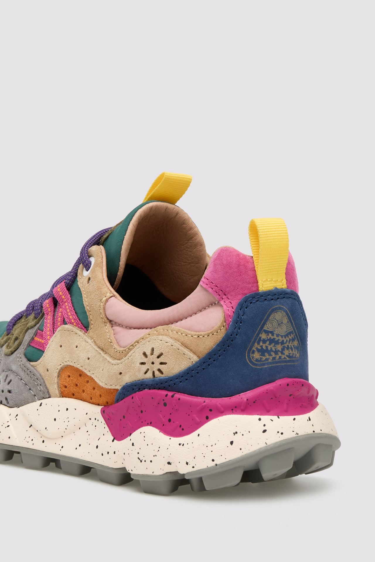 Sneaker con tomaia in tessuto tecnico, con inserti in suede multicolore. Chiusura con stringhe trekking e occhiello sagomato personalizzato. Fodera in pelle e soletta interna in sughero naturale antibatterico. Fondo in gomma ultra leggera con sagomature e battistrada dentellato.