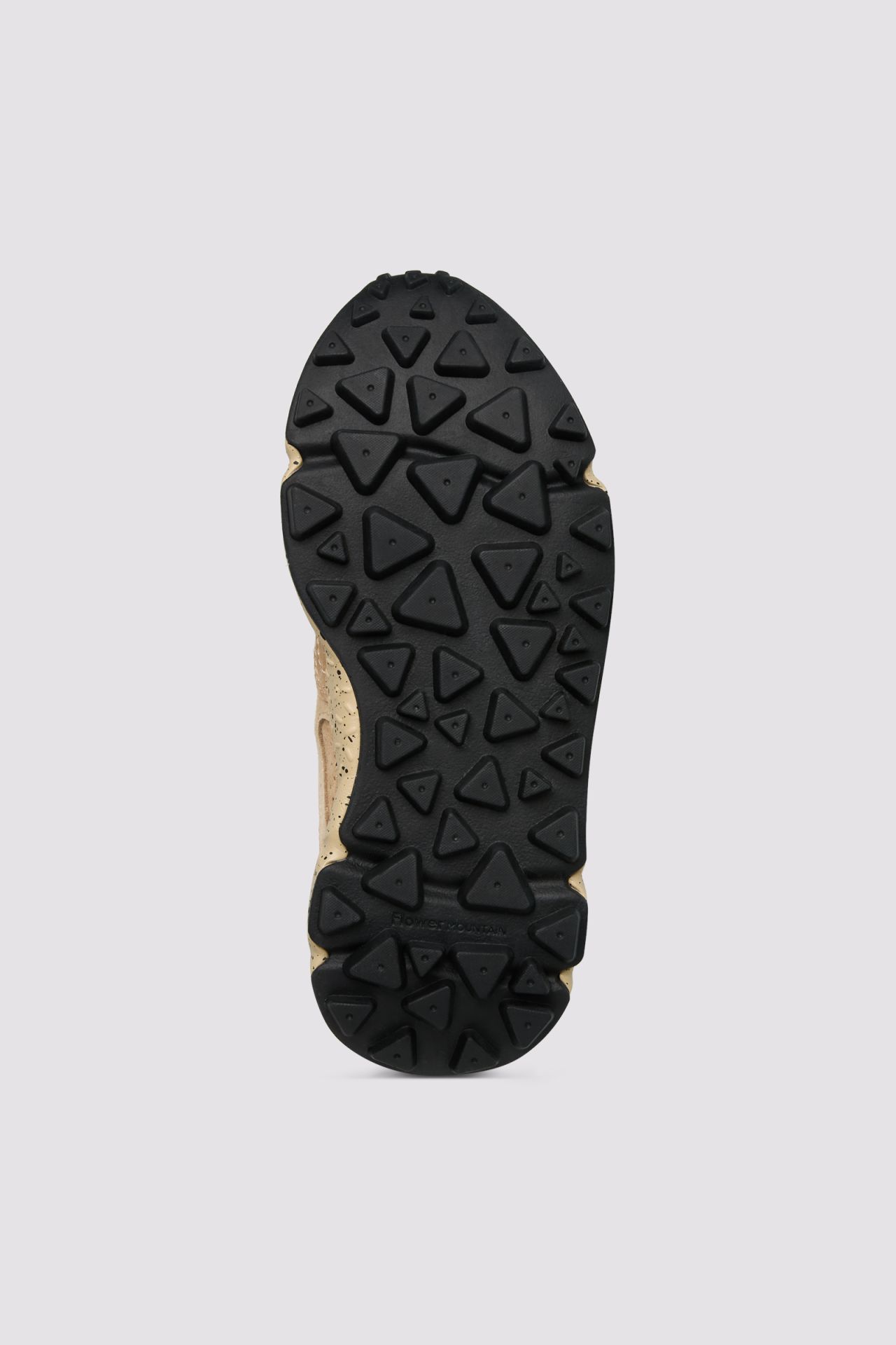 Sneaker in tessuto effetto patchwork e dettagli in suede. Chiusura con stringhe trekking a contrasto colore e occhielli personalizzati. Piccoli loop in nastro tecnico su linguetta e toppone. Fodera in tessuto e pelle, con soletta interna in sughero naturale antibatterico. Fondo in gomma ultra leggera con battistrada dentellato.